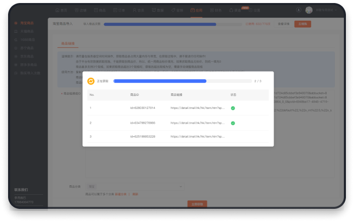 可批量导入商品信息,展示商品获取进度,获取完成后展
