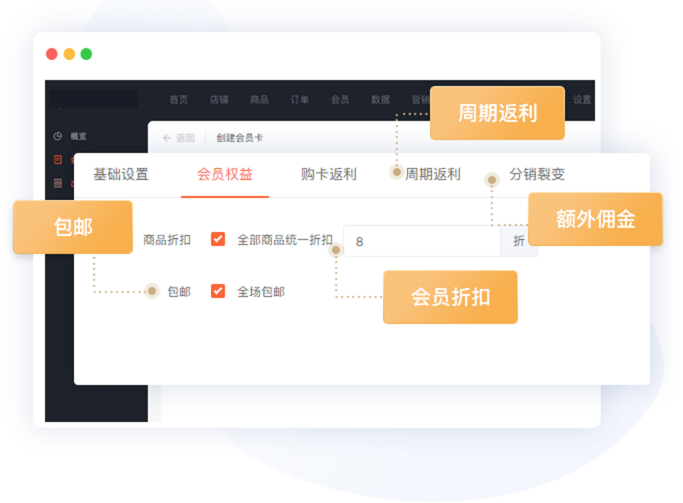 会员折扣、包邮、周期返利、额外佣金等多种权益设置,