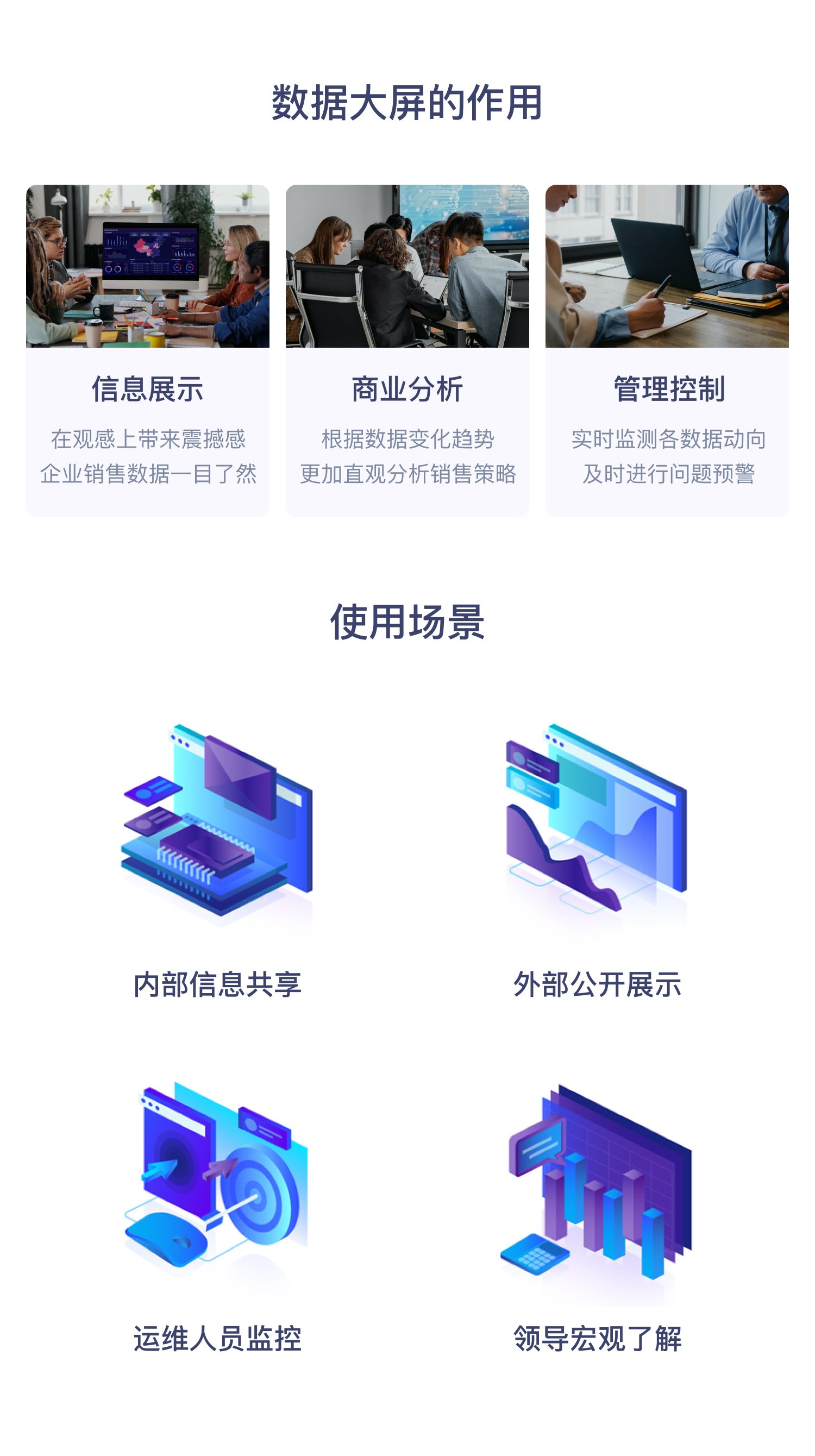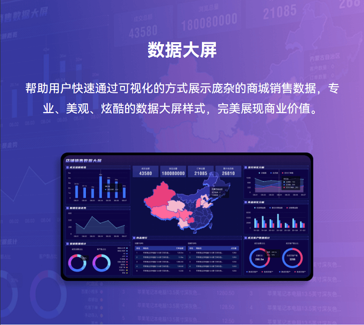 通过各类可视图表、实时数值、实时榜单等来表现数据的变化趋势、对比、关联、变量等信息,视觉效果更直观。