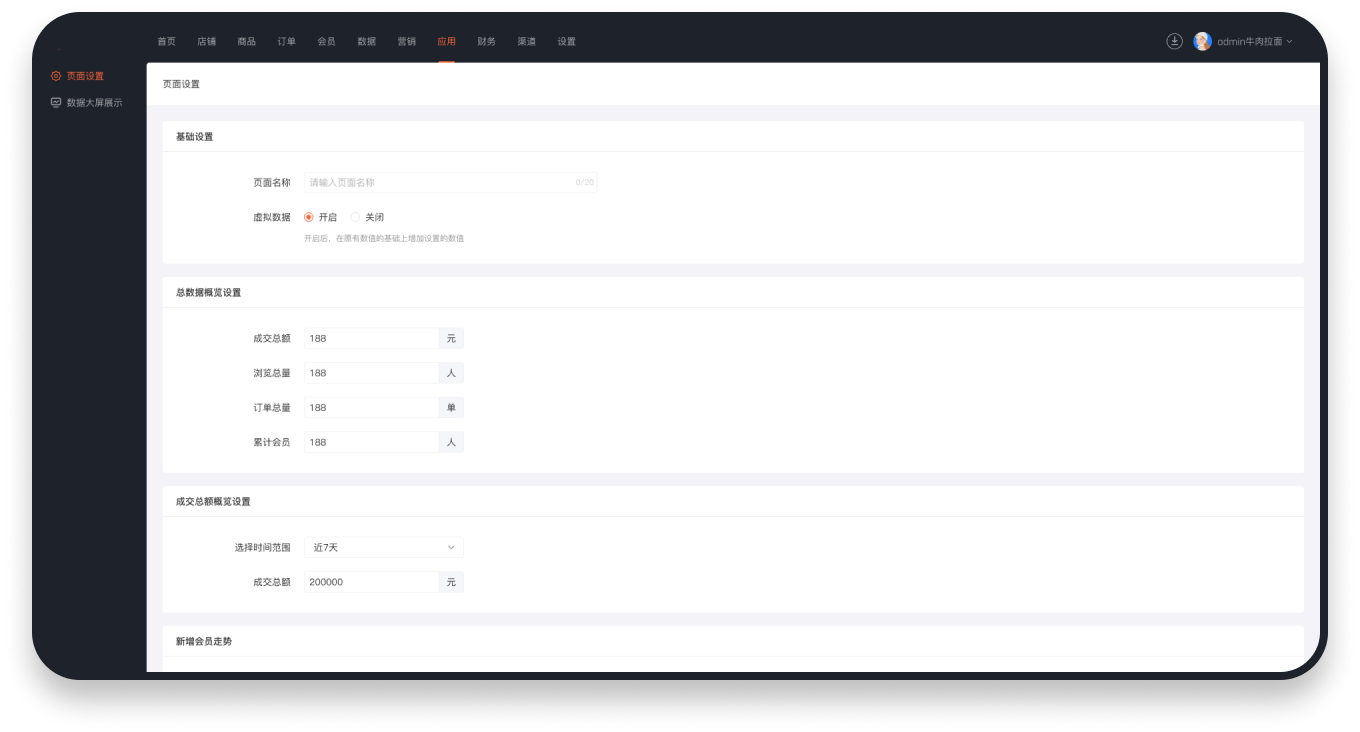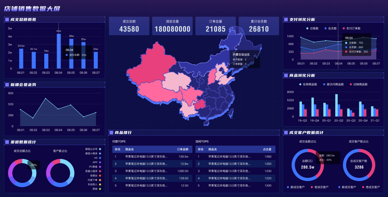 包含多个数据板块:成交总额概览、新增会员走势、渠道数据统计、商品排行、支付转化分析、商品转化分析、成交客户数据统计等。