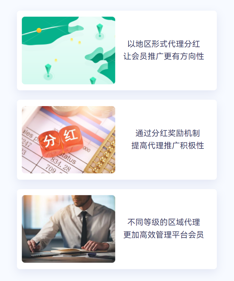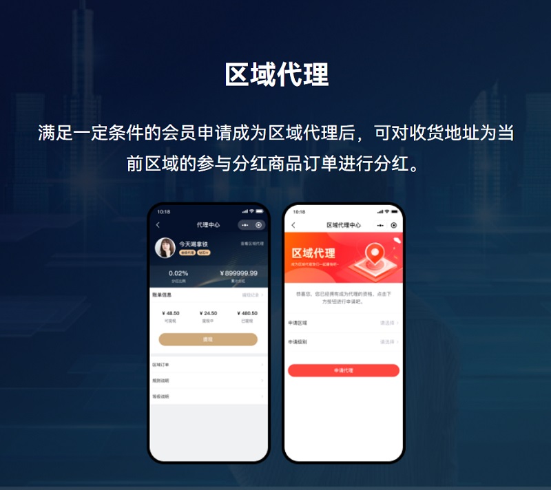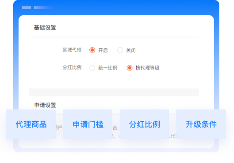 自定义代理商品、申请门槛、分红比例、升级条件、代理中心等相关设置,打造个性化的区域代理体系。